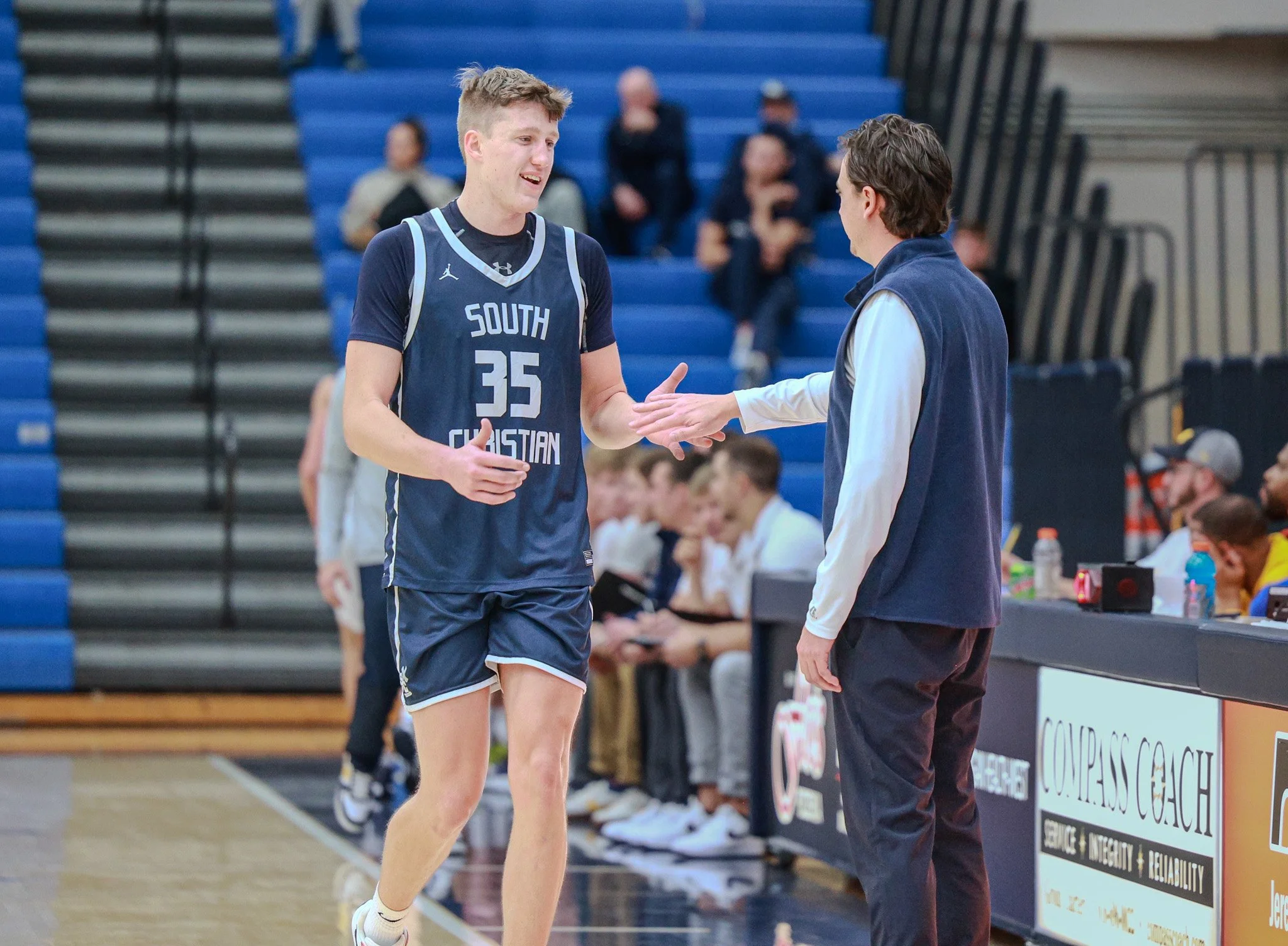 South Christian’s Davis Kemper gets a hand from coach Taylor Johnson at the Cornerstone Holiday Tournament on Dec. 27, 2024. (Photo | Lenny Padilla).